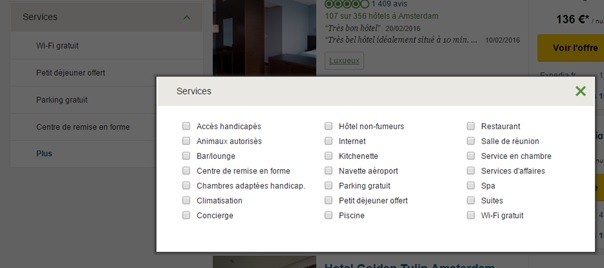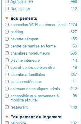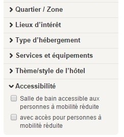 J'en ai alors profité pour comparer quelques sites connus de réservation d'hébergement. L'exemple cité plus haut est le plus maladroit d'entre eux. Les autres sites proposent des options situées dans des menus plus ou moins pertinents, tels que "Services" ou "Equipements". Un bravo tout de même pour un site proposant un menu "Accessibilité" permettant de définir ses besoins en terme d'accès.