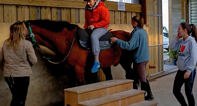 Après cela il a fallu m'aider à monter sur Solo, le cheval. À cette occasion un escalier de trois marches n'est pas de trop avec l'aide de 2 personnes pour aider à les monter. Une fois au sommet il faut suivre les recommandations de l'éducateur afin de se préparer au transfert et à l'assise sur Solo.