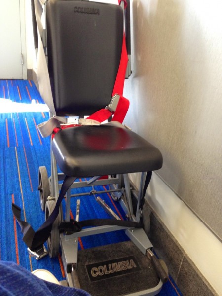 Les avions qui peuvent accepter le fauteuil en cabine possèdent un petit compartiment prévu à cet effet. C'est seulement prévu pour les fauteuils roulants manuels et pliants (j'avais en plus dû démonter les roues).