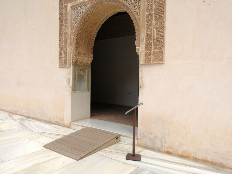 L'entrée est de plain-pied et une fois à l'intérieur, juste une petite côte te fera accéder au jardin. Les horaires de visites sont fixés pour le palais Nasrides mais il est possible de rentrer dans les jardins avant. Les chemins qui parcourent l'Alhambra sont relativement plats, goudronnés ou en sable dur.