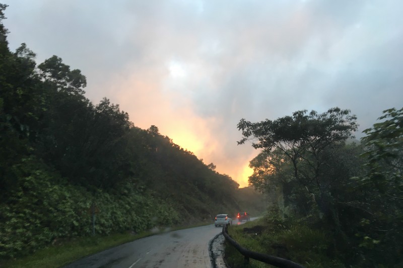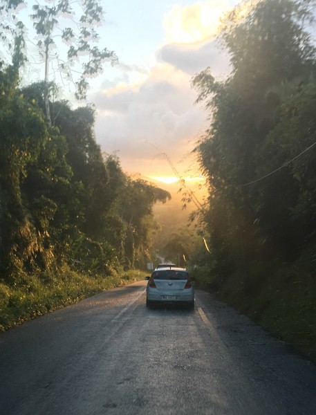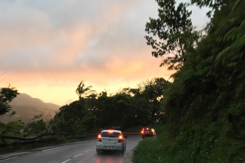 Quant à moi, je ne conduis pas et je peux profiter du paysage. Et celui-ci est vraiment incroyable ! On a une vue imprenable sur la forêt tropicale guadeloupéenne. J'ai le souvenir d'une traversée que nous avons fait un soir alors que le soleil se couchait et qu'il venait de pleuvoir. La lumière était douce et belle ! J'étais véritablement enchanté pendant tout le temps de la route ! Le conducteur, quant à lui, n'a pas passé un aussi agréable moment...