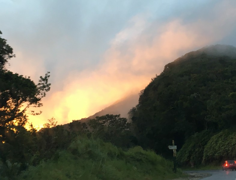 Une des choses qui me revient aussi à l'esprit, c'est la route de la traversée. Ceux qui l'ont déjà prise comprendront tout de suite de quoi je veux parler. Pour ceux qui ne la connaissent pas, comme son nom l'indique, elle permet de traverser l'île de Basse-Terre. Et l'île de Basse-Terre est très montagneuse et principalement composée de forêt tropicale. En son centre se trouve le volcan de la Soufrière.