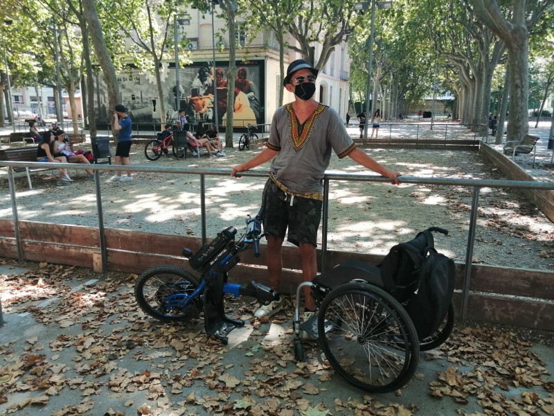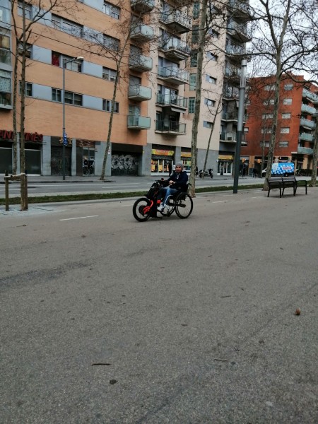 J'avais la chance d'avoir près de chez moi un atelier coopératif de cycle qui proposait à la location ce type de roue motorisée. Il la louait avec un fauteuil roulant à disposition. J'ai donc pu la louer plusieurs fois pour faire des essais pendant plusieurs jours et expérimenter plusieurs situations et donc me faire un meilleur avis..J'ai pu essayer un modèle pour tétraplégique, du coup un peu spécial, avec lequel il fallait pousser le guidon pour accélérer et le tirer vers l'arrière pour freiner. Et un modèle pour voir plaisir avec système "normal " avec accélérateur et frein comme sur une moto ou un scooter..